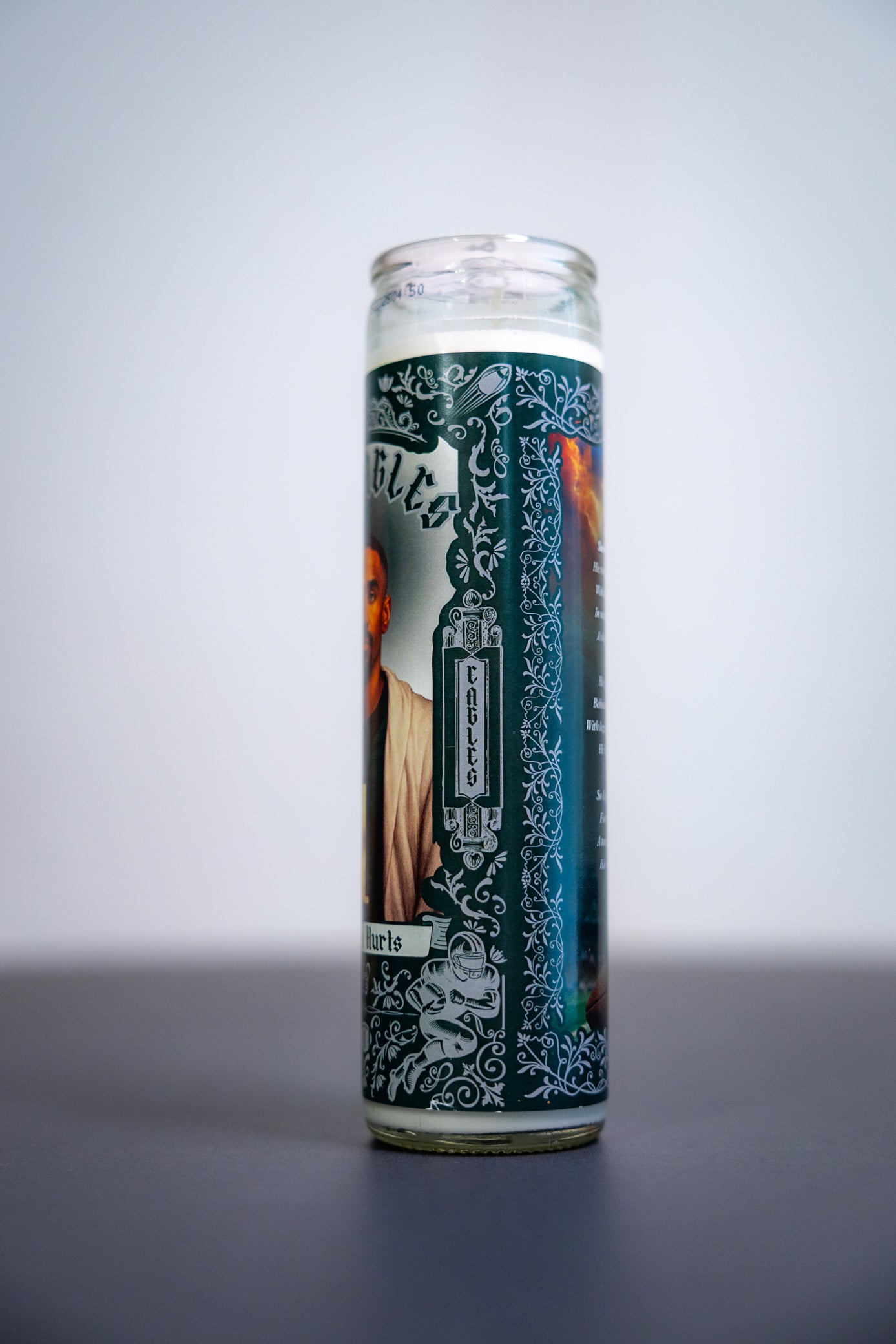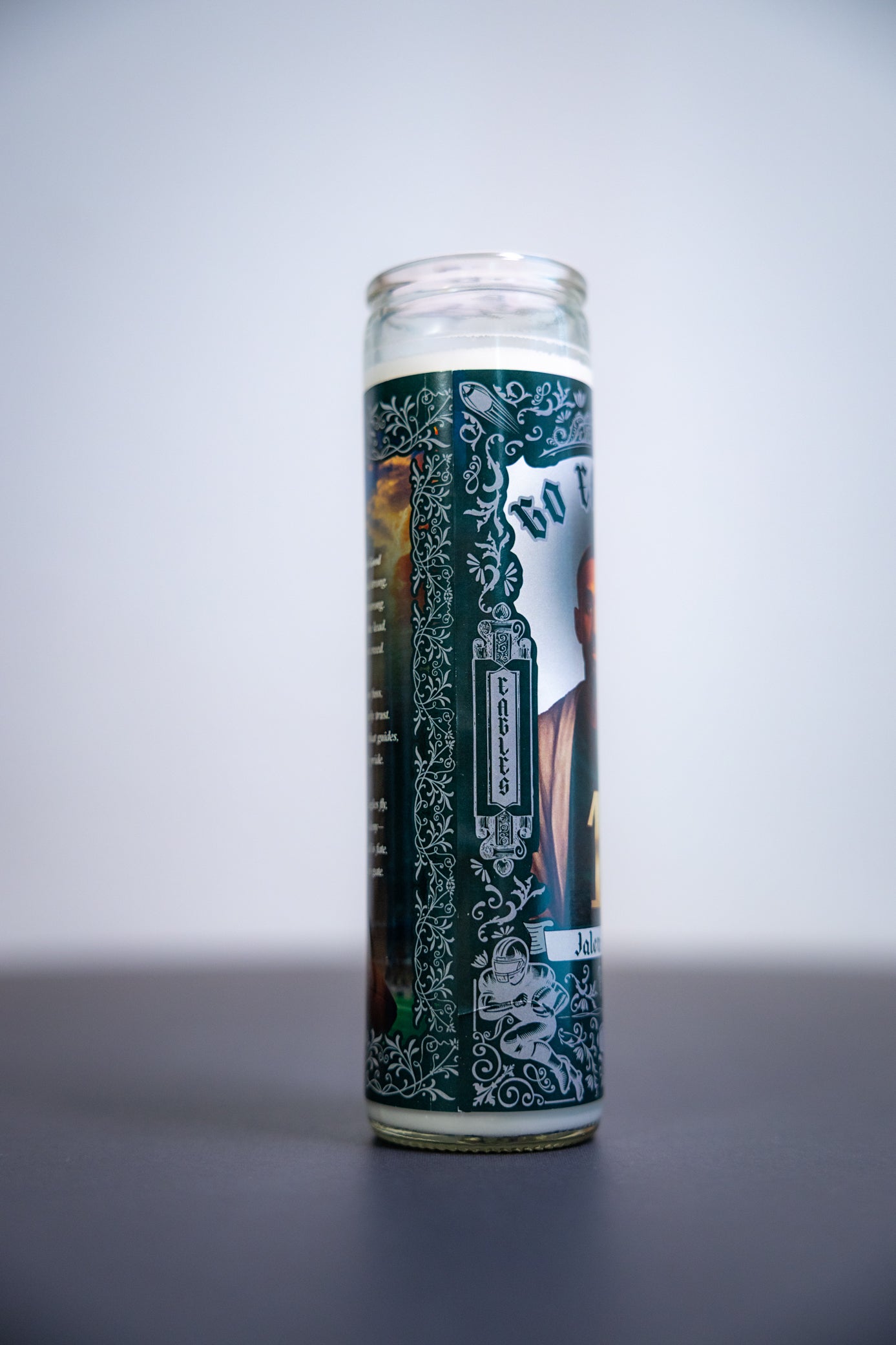Faith. Focus. Fly Eagles Fly. This NFL Prayer Candle features Jalen Hurts in radiant, saintly form—haloed in midnight green and forged with Philly toughness. Whether he's bulldozing through the goal line or dropping dimes from the heavens, Hurts is the calm in the chaos and the fire on 4th and goal.
