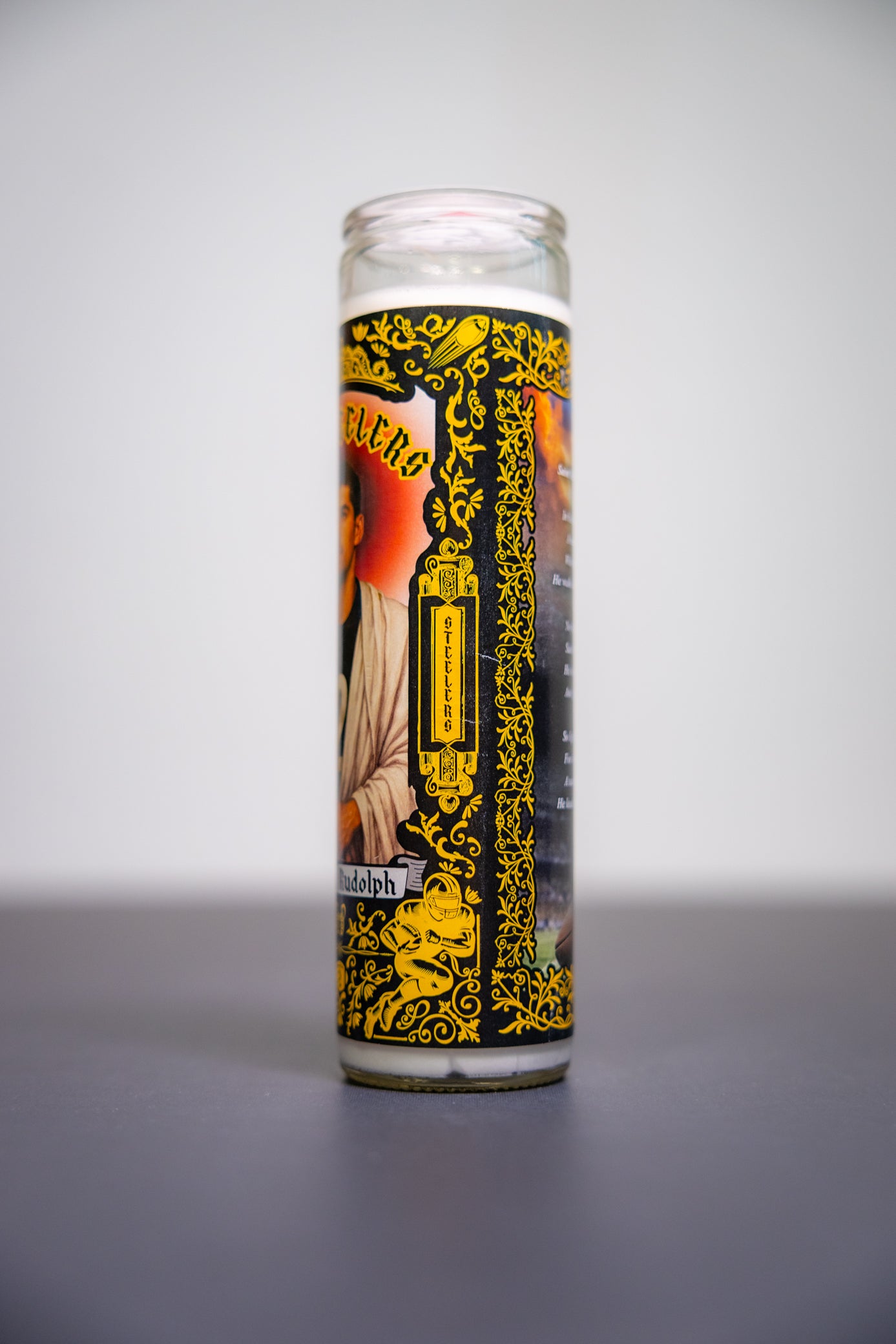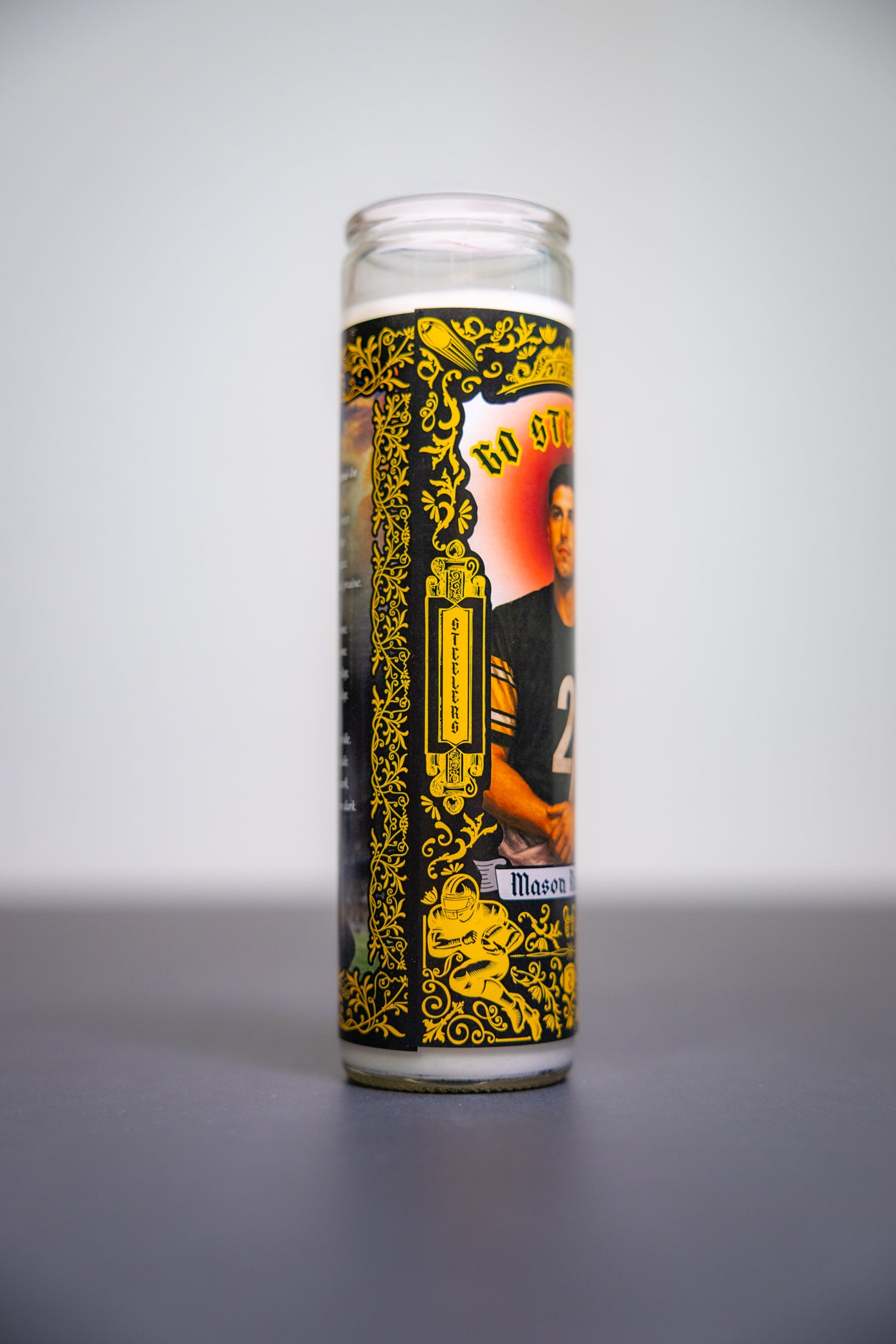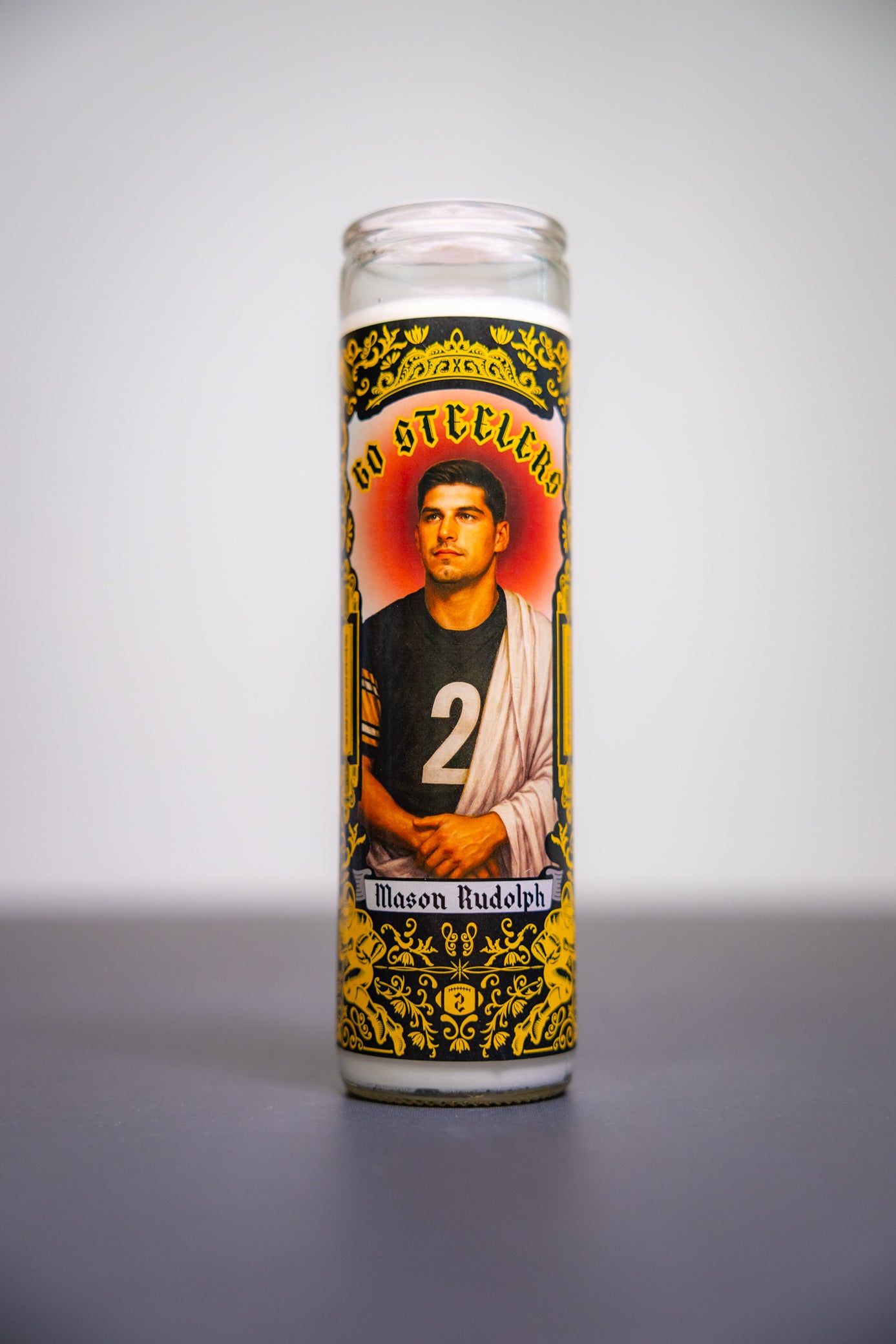 Forged in steel and lit with faith, this NFL Prayer Candle features Mason Rudolph in saintly Steelers style—haloed in black and gold, ready to lead the faithful through fourth-quarter fire. Whether you're praying for pocket presence or divine protection, this candle brings holy heat to the Iron City.